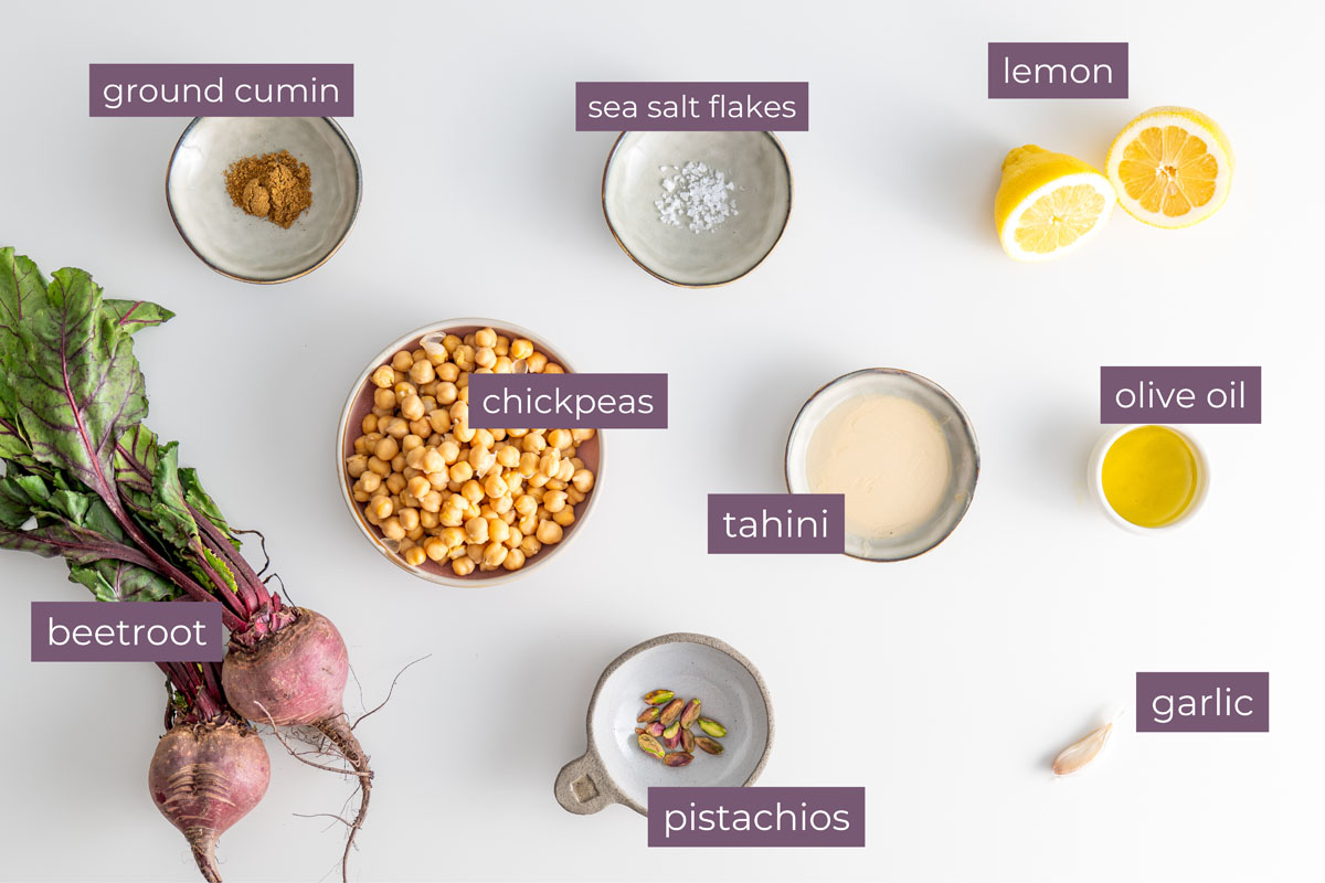 Vibrant ingredients for a beetroot hummus on a white surface.