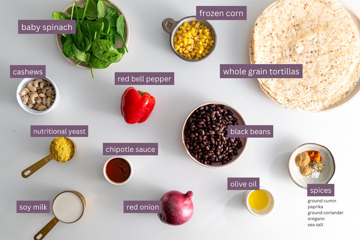 - Spread some cashew queso on half of a tortilla, then add some of the black bean mixture and top with spinach. Fold in half.