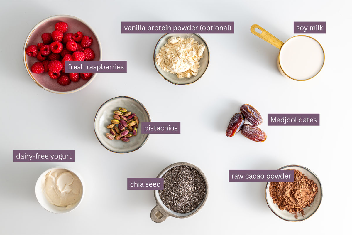 Start by adding the cacao powder, protein powder, chia seeds, dates, and soy milk to a high-speed blender. Blend everything until perfectly smooth, ensuring no lumps. Transfer the mixture into jars of your desired size. Let it set for at least 1 hour, preferably overnight, in the fridge to let the chia seeds thicken. Top the chia pudding with dairy-free yogurt, fresh raspberries, and chopped pistachios just before serving. View recipe card below for detailed instructions.