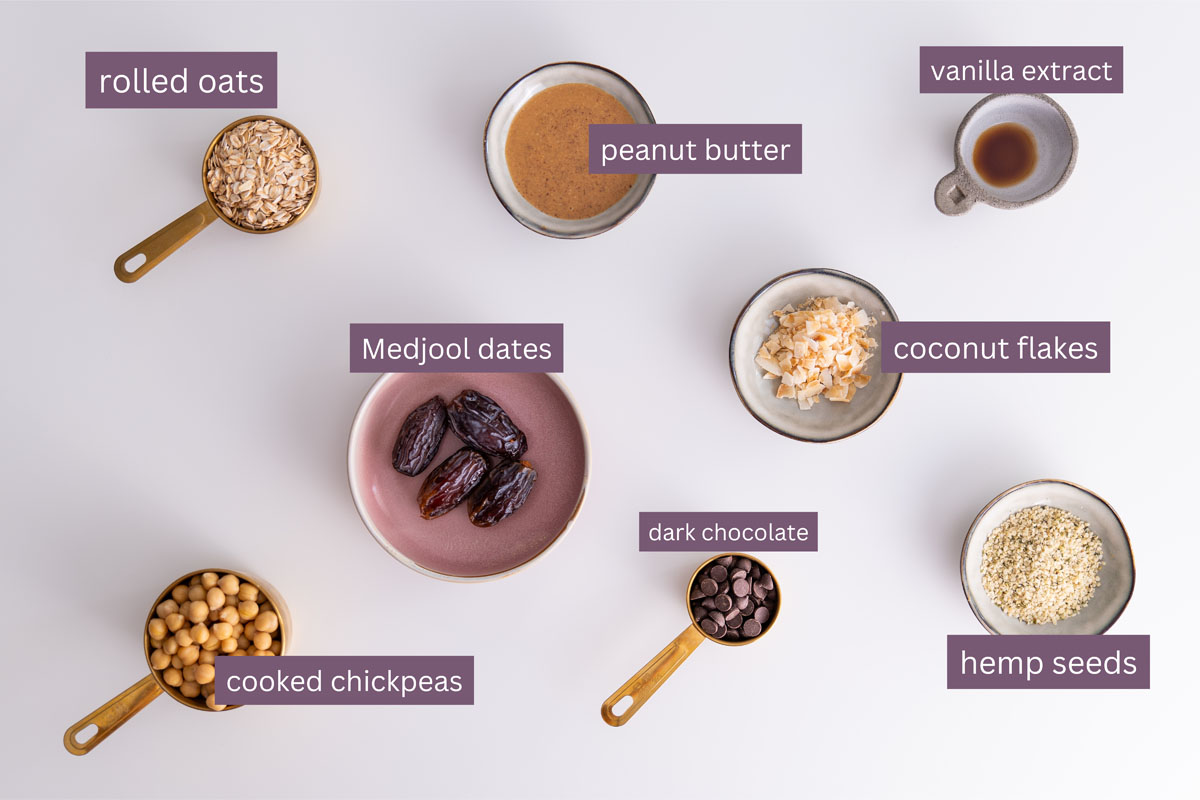 Ingredients for chickpea cookie dough bliss balls arranged on a white surface.