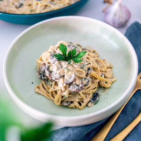 A comforting vegan creamy mushroom pasta made with a secret ingredient – blended cashews with roasted garlic and a hint of miso. Perfect for a cozy meal.