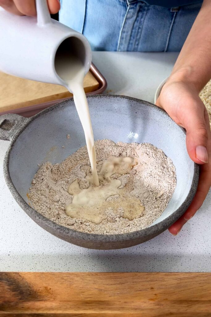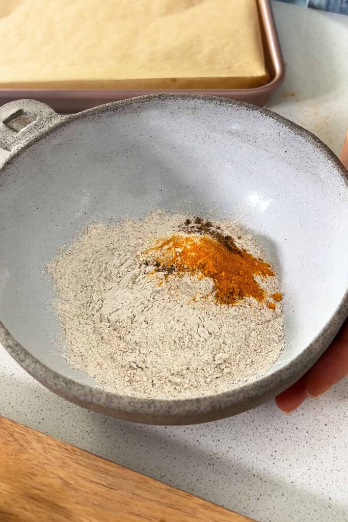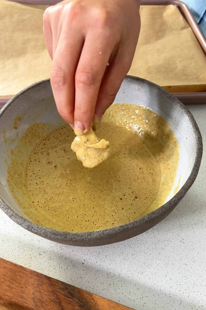 Create the cauliflower wing batter: In a large bowl, combine spelt flour, soy milk, and spices like cumin, turmeric, and garlic powder. Stir until smooth and lump-free.