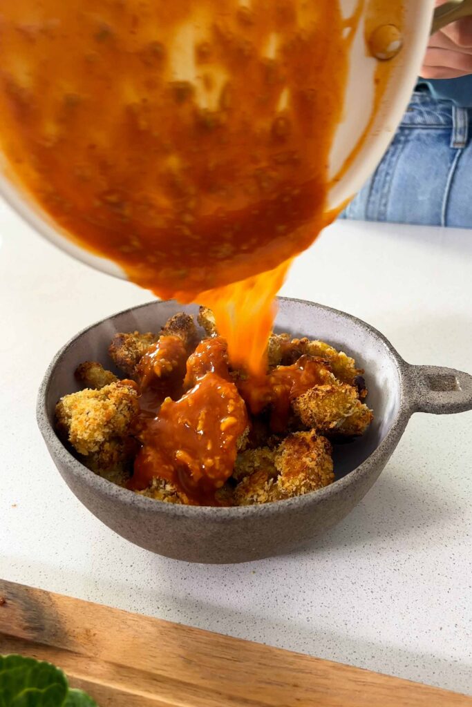 - Once the cauliflower is done, drizzle the sauce over it. Serve immediately to maintain the crunchiness. For extra crunch, serve the sauce on the side for dipping.