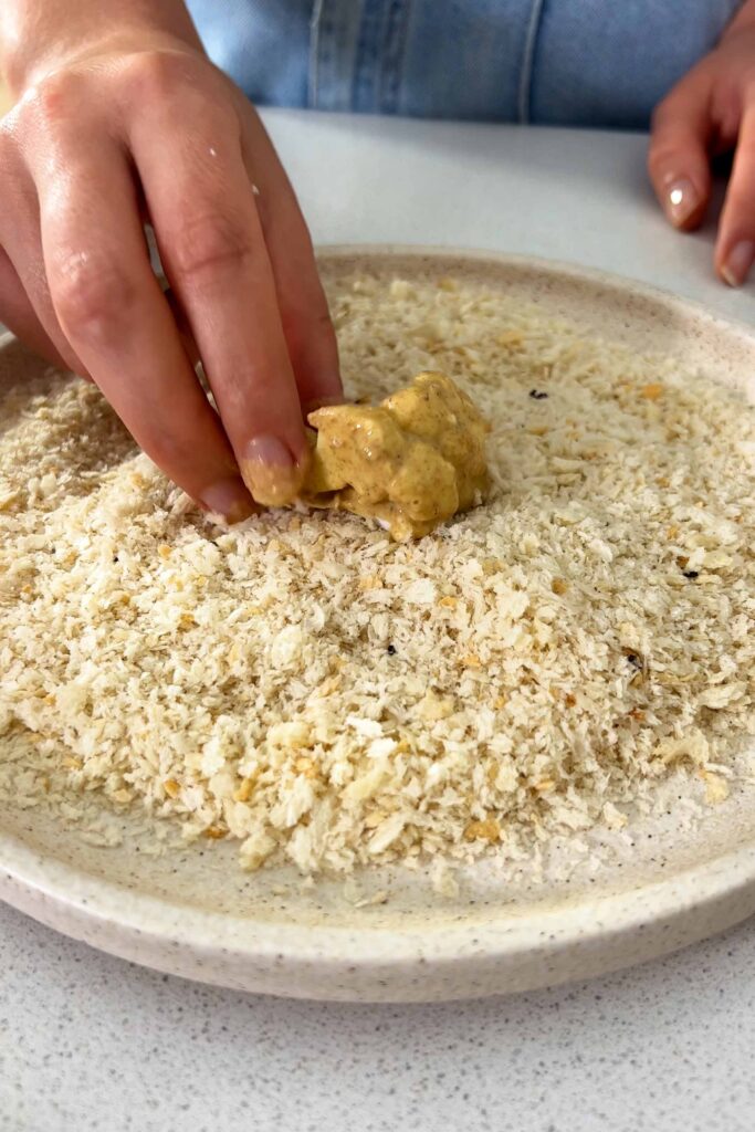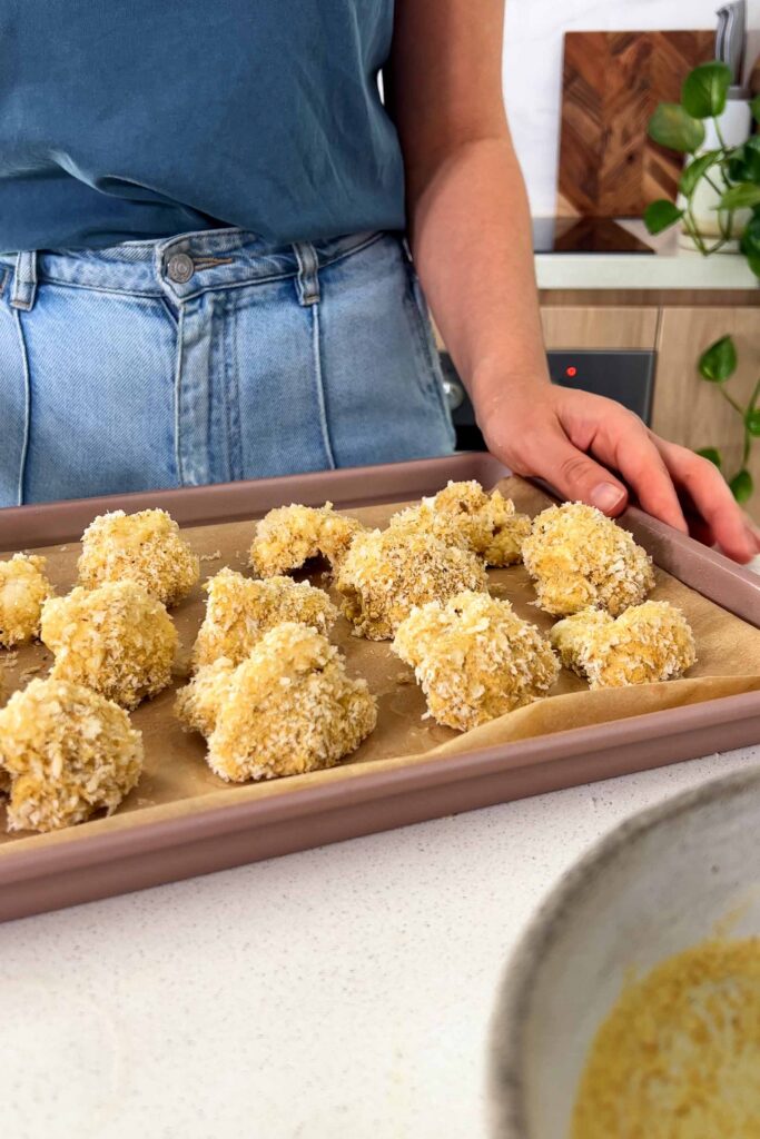 - Dip each cauliflower floret into the batter, ensuring it’s well-coated. Then roll it in the panko crumbs. Place the coated florets on the prepared baking tray.