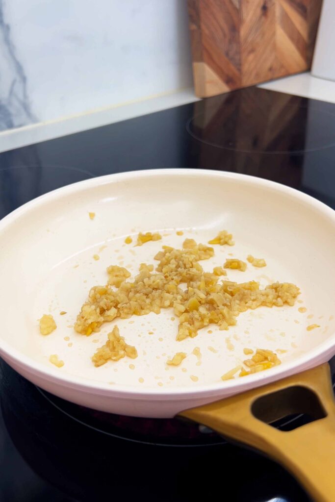 - While the cauliflower is baking, prepare the sauce. In a pan over medium heat, add sesame oil, and ginger. Cook until fragrant, about 2 minutes.