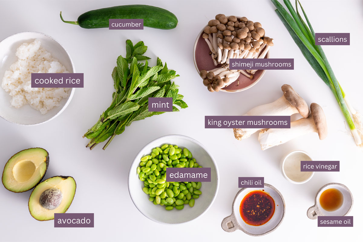 - Assemble the salad: Between 2 bowls, divide the edamame, cucumber, spring onion, avocado, mint, mushrooms, and crispy rice. Cover with peanut sauce, and enjoy!