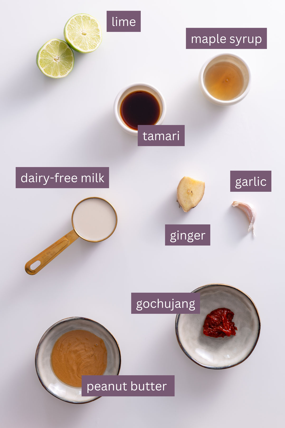 - Prepare the peanut sauce: In a small blender, add peanut butter, ginger, garlic, lime juice, tamari, maple syrup, soy milk, and gochujang. Blend until smooth.Or mince the ginger and garlic, and whisk together with the rest of the ingredients.