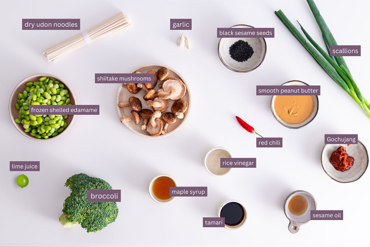 Start by cooking the shiitake mushrooms in a pan for 5 minutes. Add the sesame oil, broccoli, and edamame, and cook for 10 minutes, stirring regularly. Meanwhile, cook the udon noodles according to the package instructions, saving 1/4 cup of the cooking water. In a separate bowl, whisk together the peanut butter, gochujang, garlic, tamari, rice vinegar, maple syrup, and lime juice. Gradually add the reserved cooking water to reach your desired sauce consistency. Then mix the noodles with the sauce and veggies, and cook for an additional 2 minutes to coat the noodles well. View recipe card below for detailed instructions.