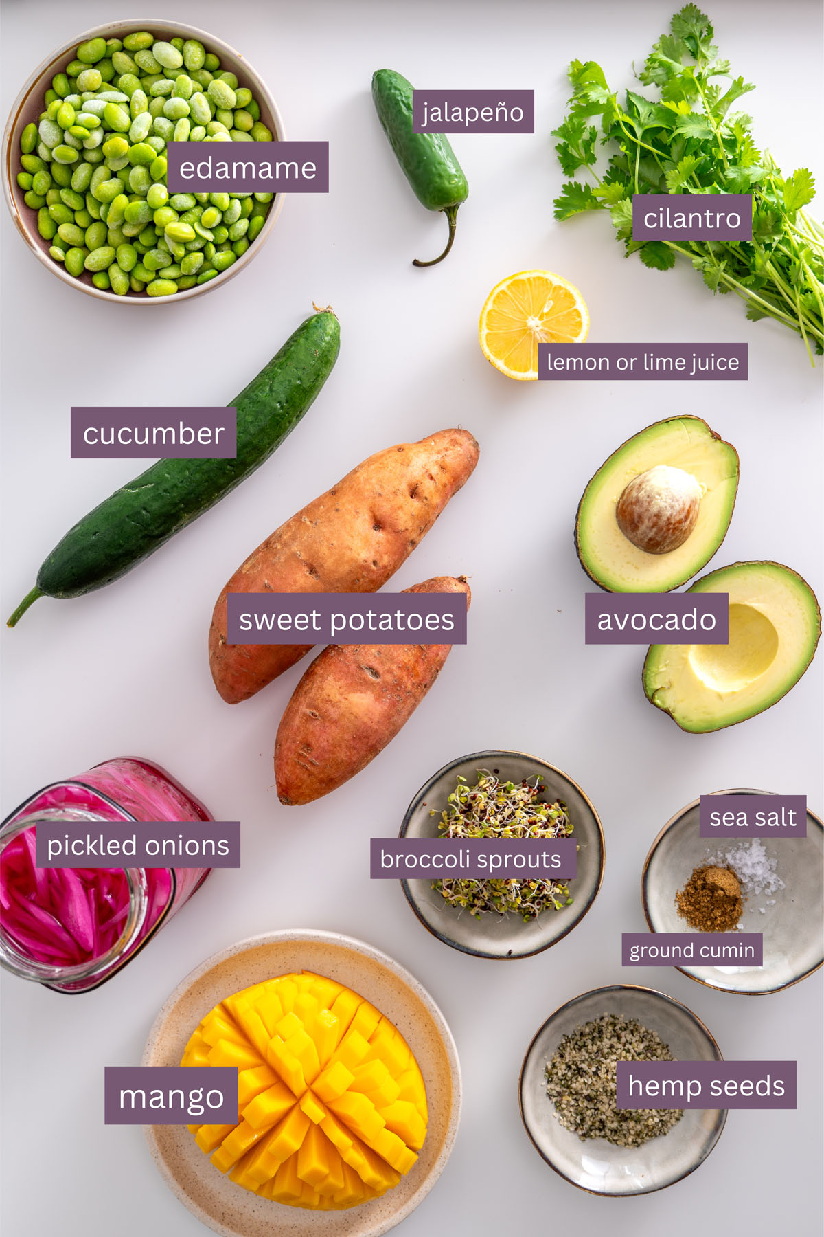 Start by preheating your oven to 400°F (200°C) and slice the sweet potatoes in half lengthwise. Place them face down on a baking tray lined with parchment paper, then bake for 45 minutes until tender. Prepare the filling by combining the edamame, mango, cucumber, hemp seeds, pickled onions, cilantro, jalapenos, lime juice, cumin, and sea salt flakes in a large bowl. Flip the baked sweet potatoes over and gently mash the insides with a fork. Top with the edamame mixture, add avocado slices and broccoli sprouts, and enjoy! View recipe card below for detailed instructions.
