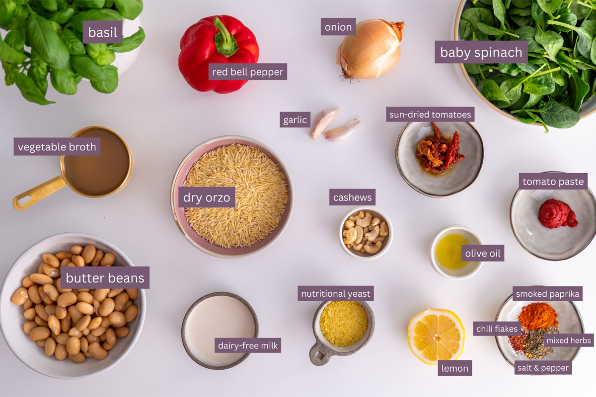 Blend cashews, soy milk, and nutritional yeast to make a creamy sauce, then add to the pan with orzo, butter beans, and vegetable stock. Simmer until orzo is tender.