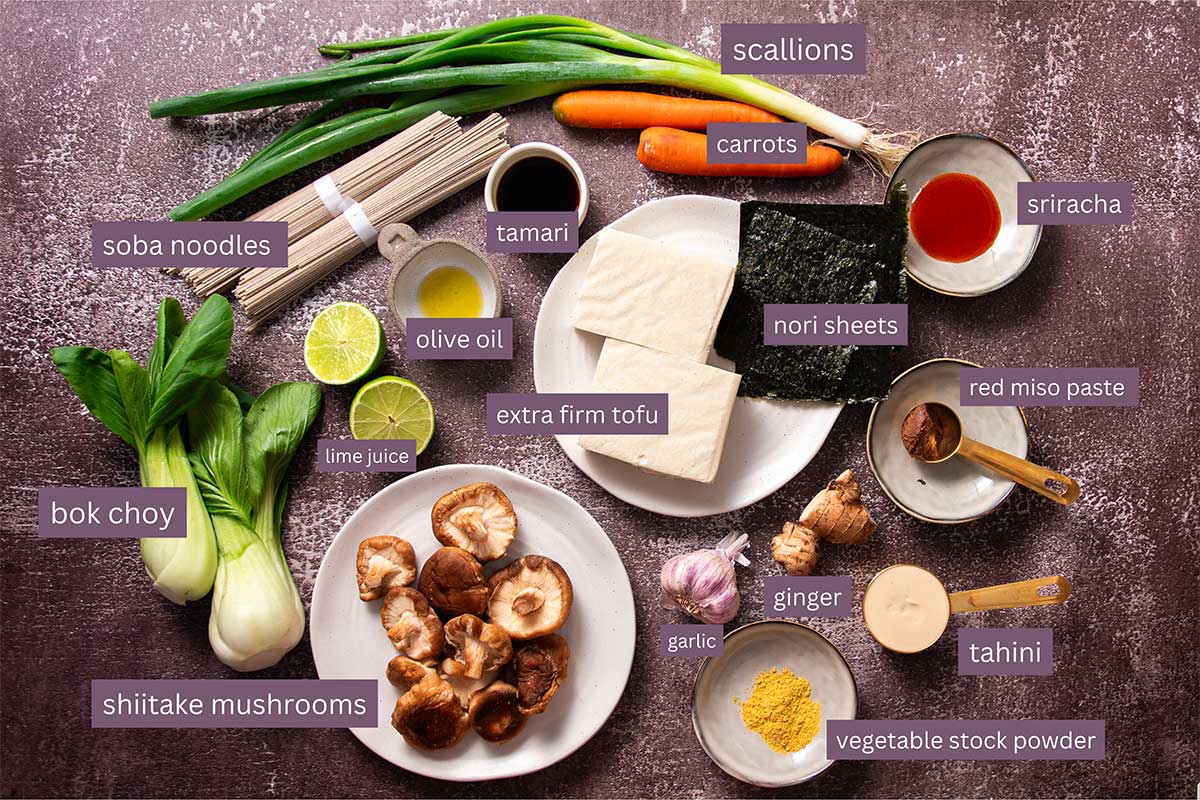 Saute the tofu and mushrooms with tamari in a pan on medium heat. Cook the soba noodles separately, then rinse under cold water. Create the sauce by blending ginger, garlic, miso, tahini, Sriracha, vegetable stock powder, lime juice, and water. Assemble the meal by layering the sauce, tofu and mushrooms, noodles, carrot, bok choy, nori sheets, and scallions (green onions) in containers. When ready to eat, cover with boiling water, stir and enjoy!