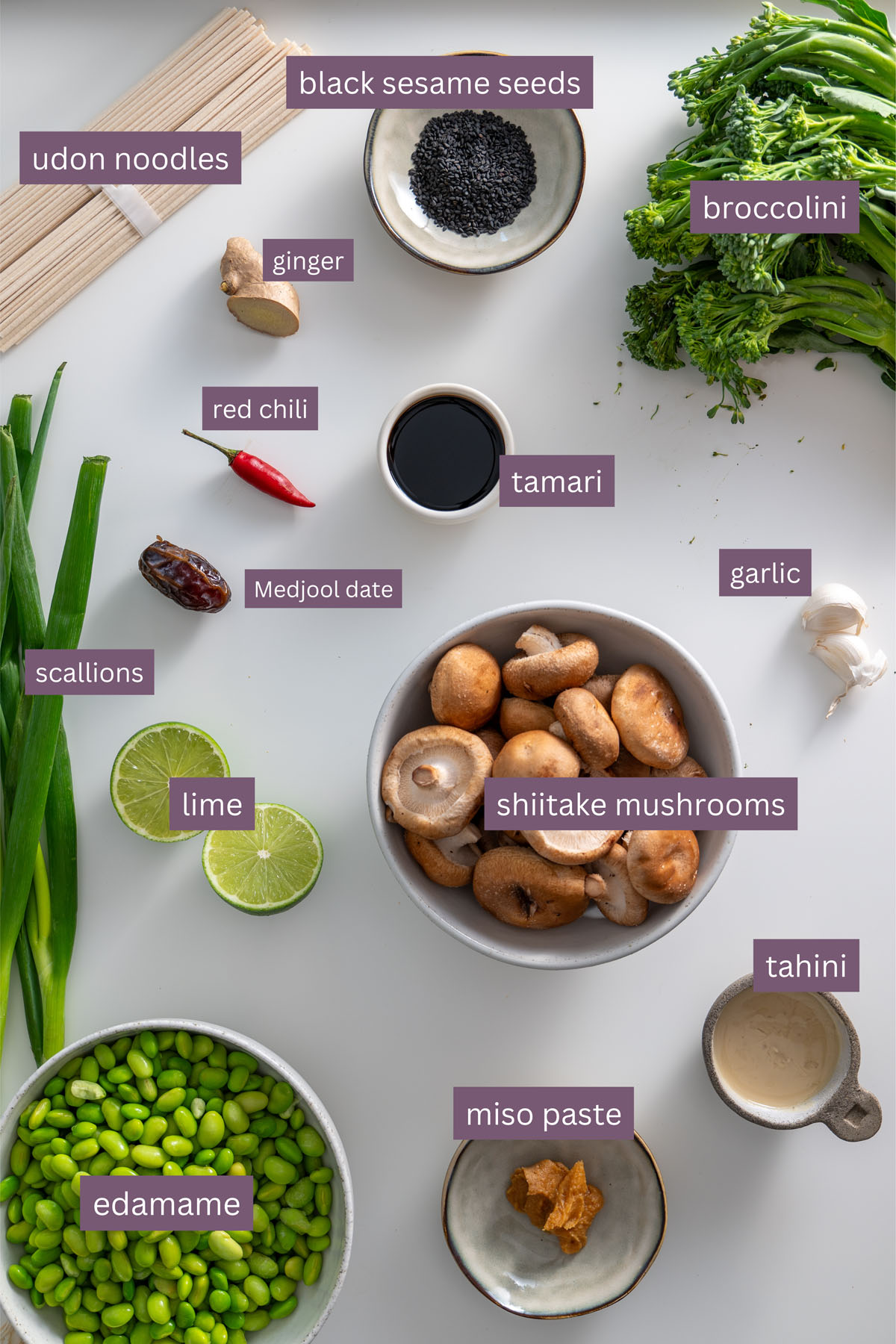 Cook the udon noodles following the package instructions. In a large pot on medium heat, cook the mushrooms with water until the water has evaporated. Add the broccolini and cook covered, stirring regularly. Then, include the green onions and cook for an additional minute. Blend the tahini miso sauce ingredients until smooth. Mix the cooked noodles, edamame, and sauce thoroughly.