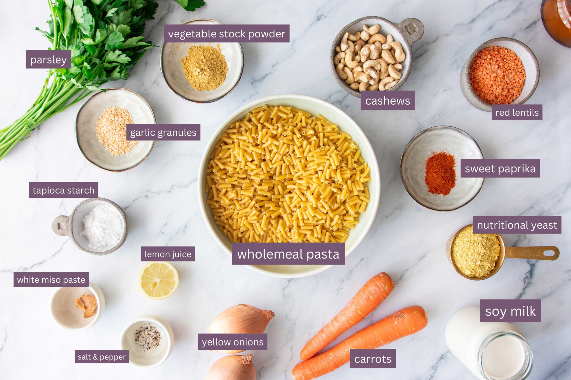 Rinse the lentils until the water runs clear. Add the onion, carrots, cashews, and red lentils to a large pot of salted water. Cook for about 15 minutes. Drain and set aside. Cook the pasta as per the packet’s instructions, reserving some pasta water. Blend the cooked veggies with soy milk and seasonings until smooth. Cook the sauce with the pasta, adjusting the taste with salt and pepper, and serve topped with fresh parsley.