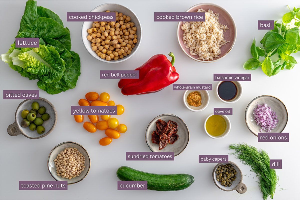 Whisk together the whole-grain mustard, olive oil, balsamic vinegar, and red onions to create your dressing. Pour the dressing at the bottom of a large salad bowl. Add the lettuce, tomatoes, red bell pepper, cucumber, chickpeas, brown rice, dill, basil, sundried tomatoes, baby capers, olives, and toasted pine nuts. Mix until everything is beautifully combined, and serve your gorgeous salad!