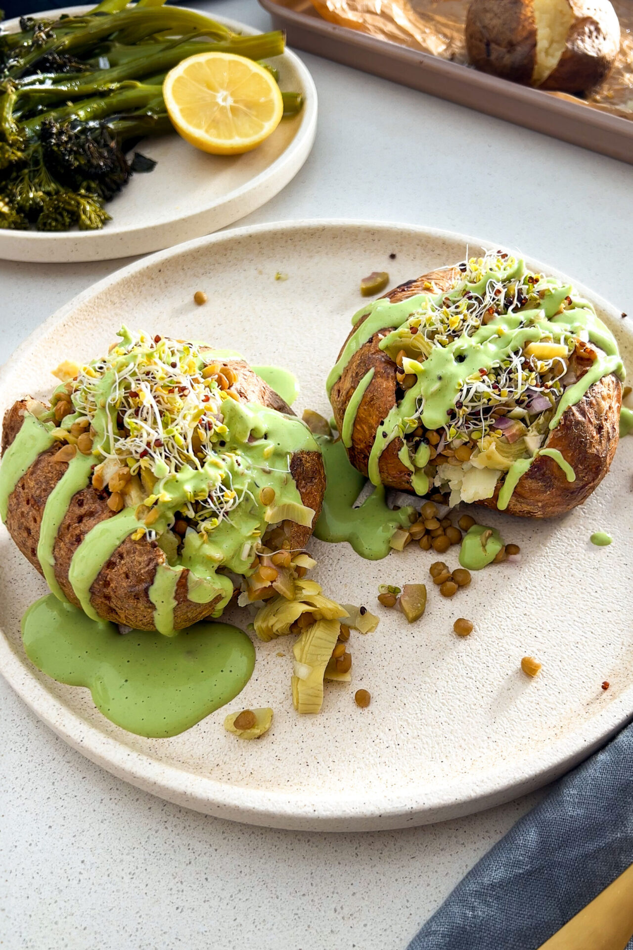 - Cut open each potato, fluff the insides with a fork, add the filling and broccoli sprouts, and drizzle the green dressing. Enjoy!