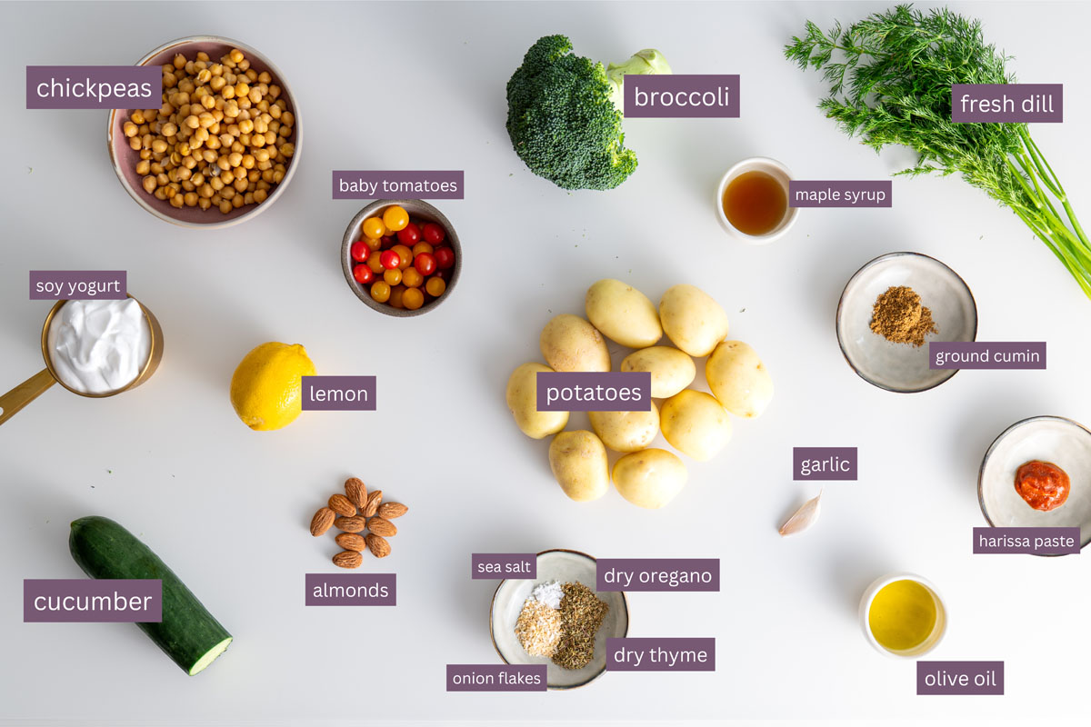 A flavorful, easy-to-make mid-week dinner featuring roasted potatoes, chickpeas, and broccoli with a homemade tzatziki sauce.