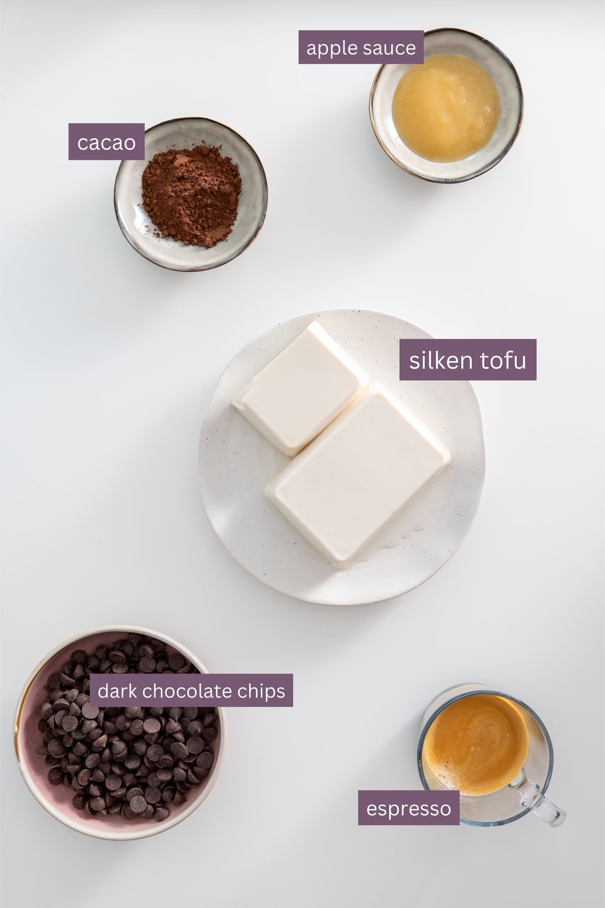 - Blend the filling by combining the silken tofu, melted chocolate, espresso, applesauce, and cacao powder in a blender. Blend until silky smooth.