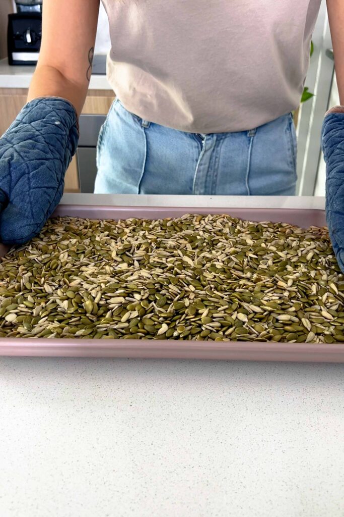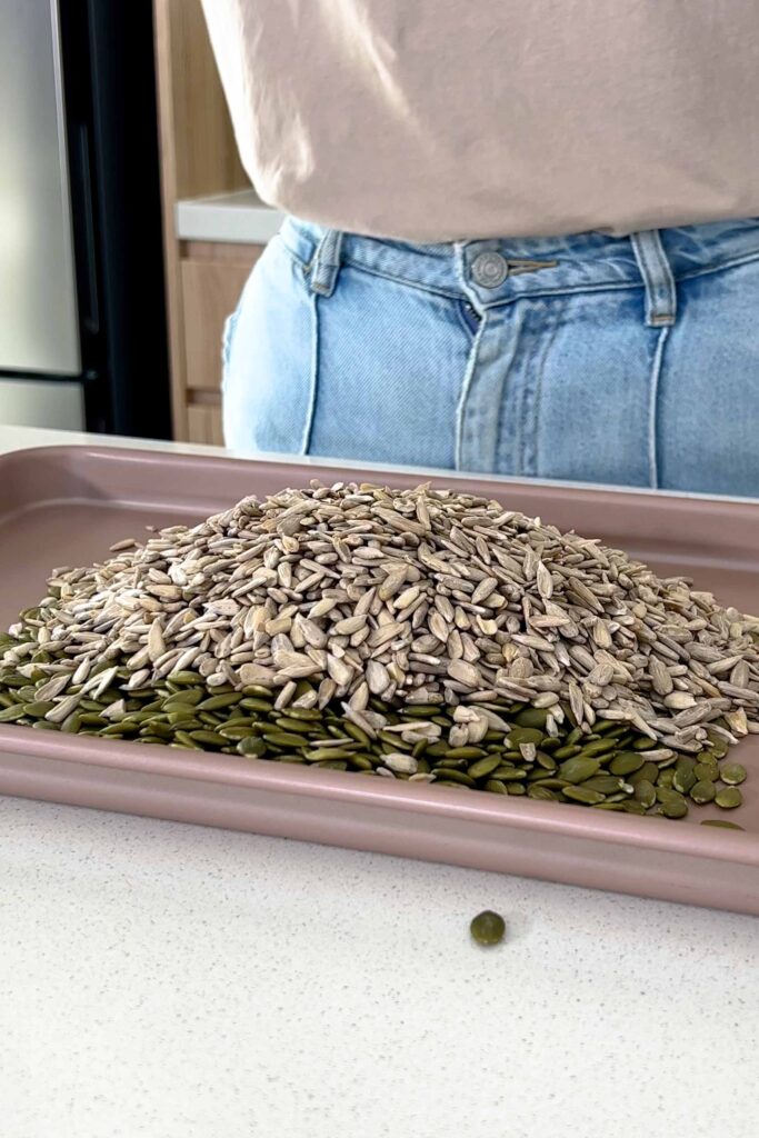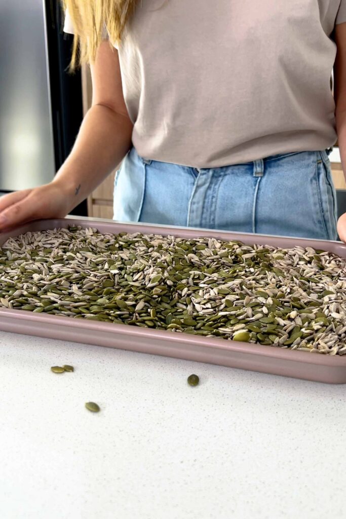 - Preheat the oven to 180C (350F). Place the pumpkin and sunflower seeds on an oven-safe tray and bake for 10 minutes, stirring halfway, until slightly golden. Roasting enhances the flavor and helps release natural oils.