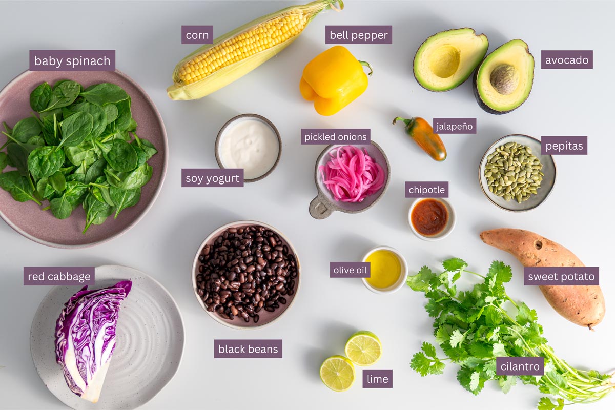 Preheat your oven to 400°F. Line a large baking tray with parchment paper and combine the sweet potatoes with olive oil. Bake for 30 to 35 minutes, rotating the tray halfway through. Cook the corn and chipotle in a small pan for 5 minutes. Blend the yogurt, cilantro, jalapeño, lime juice (and zest), salt, and cumin in a high-speed blender to make the dressing. Combine the spinach, black beans, bell pepper, cabbage, cooked sweet potato and corn, pickled onions, pepitas, and avocado in a large salad bowl. Drizzle with the Creamy Cilantro Dressing, mix to combine, and enjoy! View recipe card below for detailed instructions.