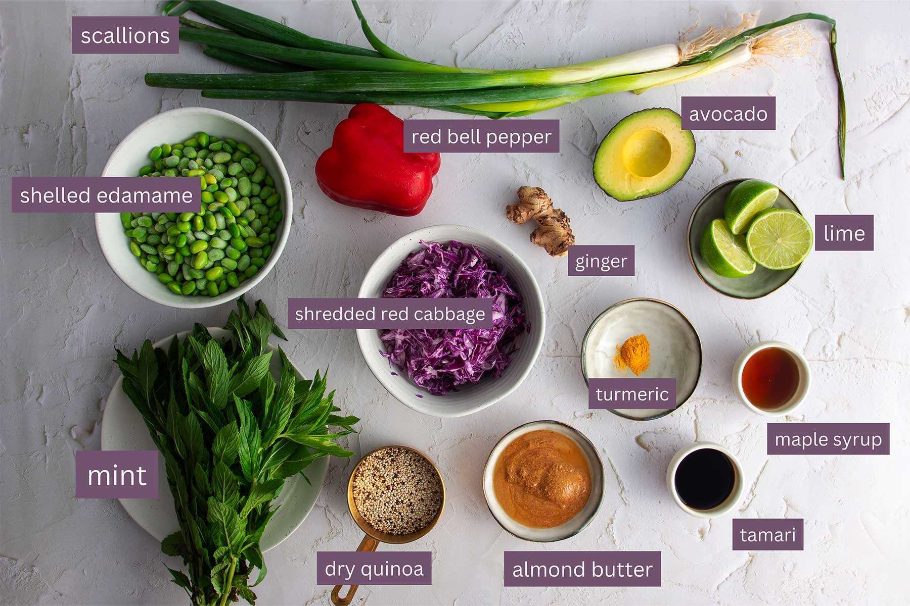 An array of fresh ingredients for Turmeric Quinoa and Edamame Salad Meal Prep neatly laid out on a light surface, labeled for easy identification.